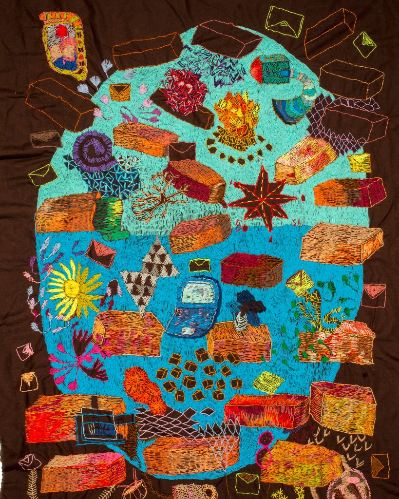 Así en la tierra, se edifica a partir del pensamiento y de una iconología peronista presente en bordados, objetos y fotografías que activan memorias políticas y afectivas. Estas imágenes no funcionan como citas cerradas, sino como superficies abiertas a la relectura y a la reinscripción, donde el tiempo del trabajo y la persistencia del gesto adquieren un valor político. La propuesta multisensorial busca provocar nuevas miradas sobre un fenómeno político que no cesa de reescribirse y de encontrar resonancias en la actualidad.
