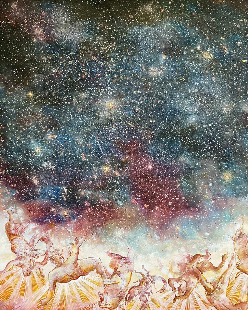 El artista cordobés residente en Estados Unidos desde hace décadas, invita al espectador a sumergirse en un mundo donde la realidad y la ficción se entrelazan en un juego de símbolos, espejos y laberintos. Sus dibujos y pinturas -con obras en pequeño, mediano y gran formato- evocan la fragilidad del tiempo y la memoria. Los poemas-visuales de Simes son lúdicos, crean un juego permanente entre la consonancia y la disonancia, entre el azar y la predestinación, dice Antacli.